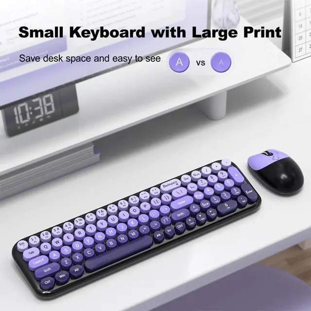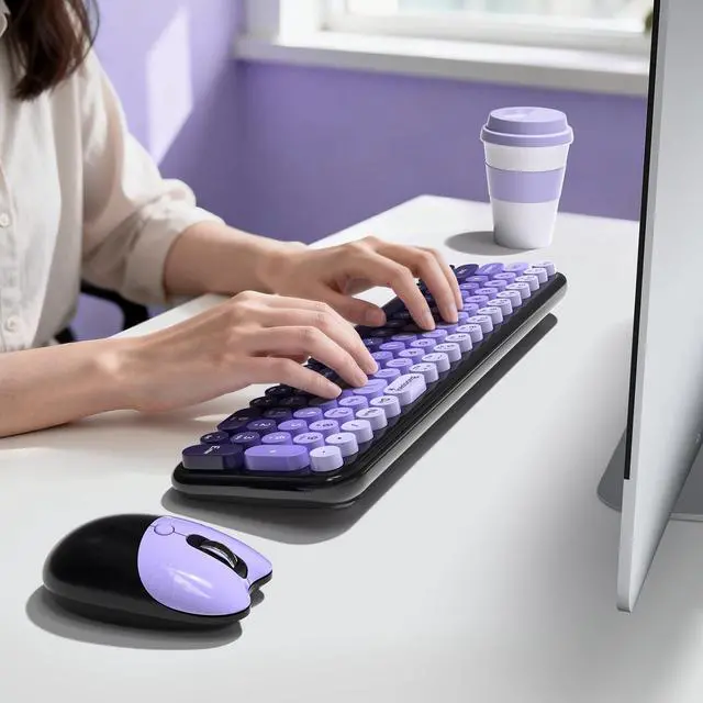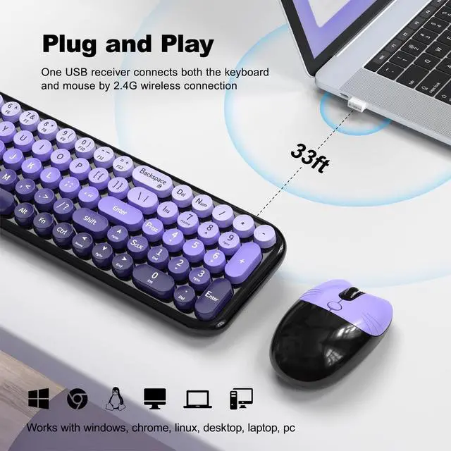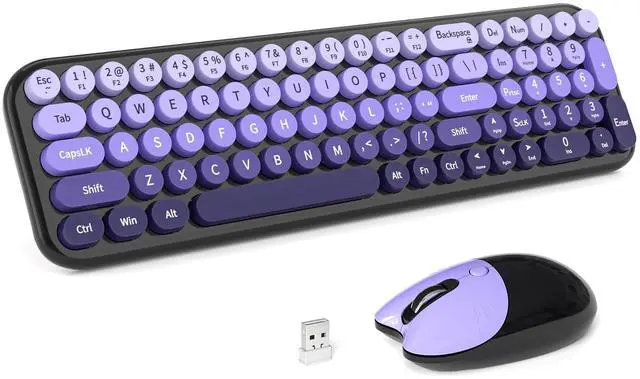 Blackpurple-Gradient Wireless Keyboard and Mouse Combomost popular color of 2025, to attract more people's eyes, give you a different vision, enjoy a different keyboard experience, create a colorful desk, and be a pleasant mood for you! ^^ Floating Button DesignAll buttons adopt a floating circular button design, and are also equipped with a brush to clean the garbage on the keyboard. The floating button design gives you a soft and quiet feeling, and takes you back to the most original type of Typewriter Style! ^^ Wireless 2.4G Techplug and play, 35 feet working range, 2-in-1 nano receiver, no need to install other software, no delays or Drop the line, Make your desk surface more neat and tidy, Keyboard or mouse can be used separately, just insert a single USB Receiver to use your Typewriter Wireless Keyboard Mouse Combo! ^^ Automatic Power Saving FunctionmodeIf you don't use the keyboard for more than a minute, the keyboard will auto-enter the sleep mode to save power, which greatly prolongs the battery life, Click any key or button to wake up within 2 seconds, If one day the keyboard suddenly does not work, please replace the battery and try to use it, when the battery is dying, the low battery indicator on the typewriter keyboard will remind you to replace the battery.