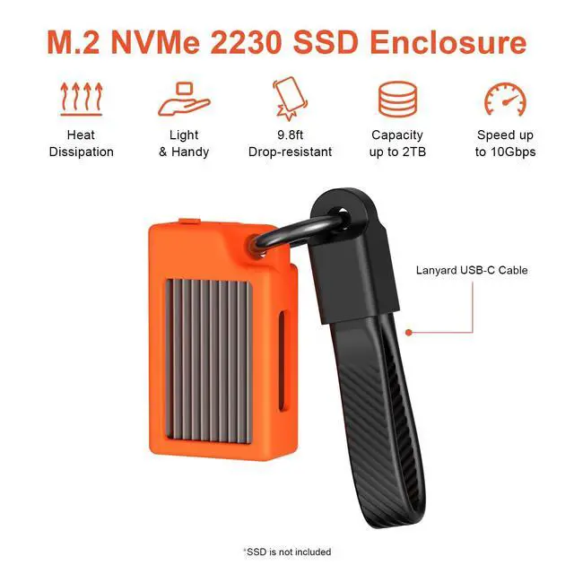 Qwiizlab M. 2 NVMe SSD Enclosure with Metal Heat Sink, 10Gbps USB-C 3.2 UASP, Supports 2230 form factor PCIe M Key up to 2TB, SSD Not Included, Orange