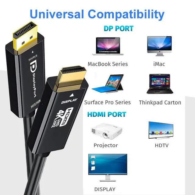 The Clear Picture YOTETION DisplayPort to HDMI cable See the images, not the pixels. When it comes to picture quality, you shouldn't have to sacrifice clarity for convenience. No more picture distortion! The chip in the YOTETION 4k DisplayPort cable allows you to experience crisp, stunning visuals and audio every time. Plug And Play Thanks to the easy plug-and-play design, theres no need for installation or software drivers. This display port to HDMI cord has a user-friendly design that makes for a simpler and faster setup, so you can start playing games and watching movies right away.