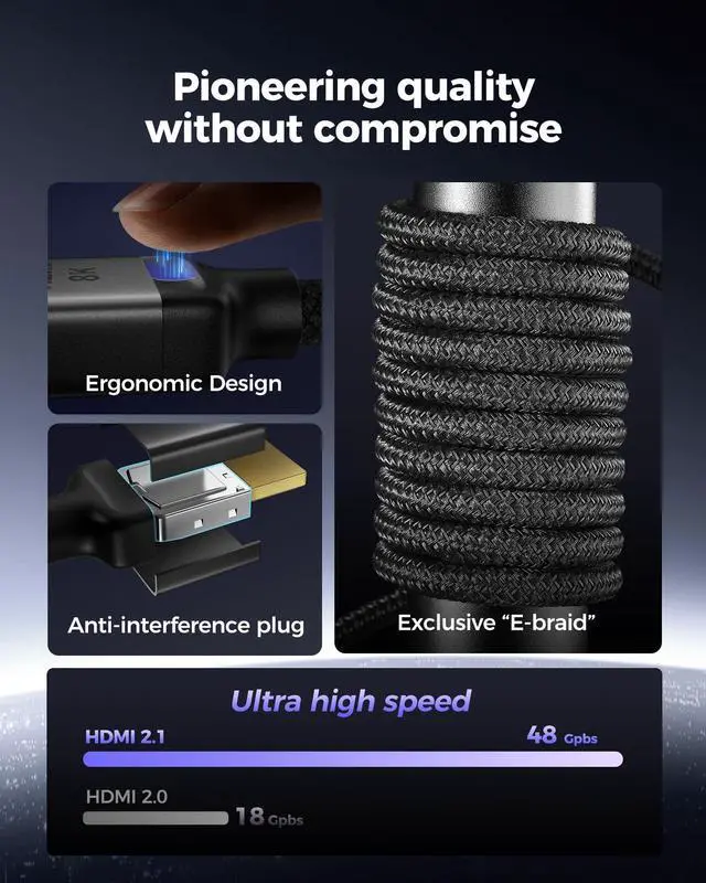 120Hz/144Hz Gaming ExcellenceElevate your gaming experience with smooth picture 4K@120Hz gameplay for PS5 and Xbox, and ultra-responsive 4K@144Hz for PC. Whether you're pushing your console or PC to the limit, enjoy unparalleled performance across all platforms(Requires game to support 4K@120Hz). ^^ Exclusive "E-Braid" TechnologyExperience unprecedented durability with our unique Double-layer Fishnet Winding and Nylon Braiding techniques. Copper Cores and Ferrite Magnetic Beads ensure uninterrupted signals, eliminating Black Screens and Flickering, bringing you smooth experience. ^^ HDMI 2.1 -48Gbps BandwidthUnleash the full potential of your devices with lightning-fast data transfer rates, ensuring seamless connectivity for all your high-definition needs.