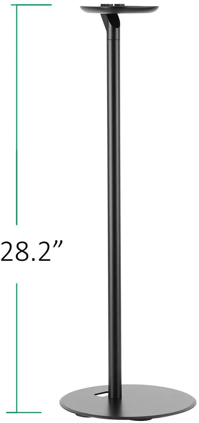 SL & Play: 1 ^^ built in channel for cable management, quick and easy assembly ^^ unbranded to give cleaner look and not draw attention away from speaker ^^ rubber feet to reduce vibrations to floor ^^ stands are 28.2 inches tall without the speaker. They have a 9.8 inch diameter on the floor base and 1 inch diameter on the pole. The speaker shelf is 5 inches x 4.9 inches
