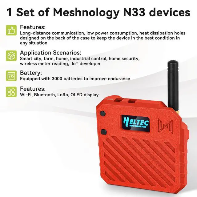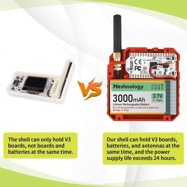 LoRa V3 processorOur ESP32 LoRa V3 development board is equipped with an advanced dual-core processor and 3.7V 3000mah battery life, running processing at a clock speed of 240 MHz, which greatly improves your work efficiency. The single battery-powered main board can last up to 26 hours in USB powered state, ensuring that your network projects are not affected ^^ StabilityOur products avoid the factor of unstable signal output by combining the form of a package, while RF shielding prevents interference, and integrated Wi-Fi, LoRa, and Bluetooth functions experience seamless connection, ideal for remote communication applications such as LoRaWAN and wireless sensor networks, equipped with two 915MHz Meshtastic antennas ^^ Meshtastic CaseOur protective case is made of durable materials.