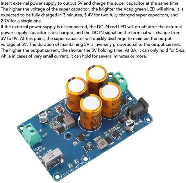 [Smart Power Indicators] Equipped with led indicators, the ups displays connection status with dc in green, 5v output with red light, and capacitor voltage with vcap green light. ^^ [Compact & User-friendly] Featuring a lightweight and compact design with a 90x56mm size and 3.5 mm locating hole, this ups is easy to install and for on-the- backup needs. ^^ [Power down Endurance] With a power down endurance time of 10-60 seconds, this ups provides ample time to save data in case of power outages. ^^ [High Reliability Design] This super capacitor ups ensures continuous power supply in high-reliability scenarios, seamlessly switching to capacitor discharge when the external power source fails.