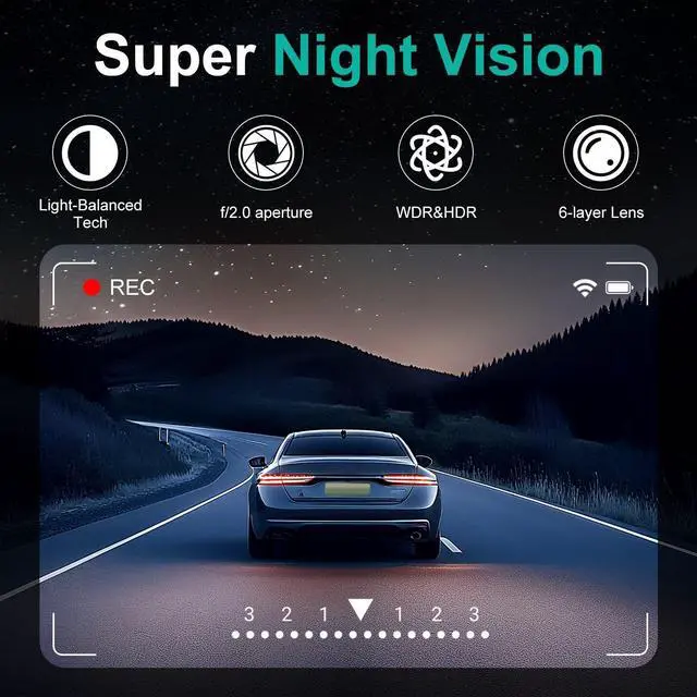 Control your dash camera for cars effortlessly with the responsive 4-inch touch screen. Quickly navigate menus, adjust settings, and lock important videos with just a tap. The car dash cam front and back user-friendly interface allows for one-handed operation, keeping your focus on the road while ensuring smooth, hassle-free use. ^^ Super Night Vision & Parking Monitor 24/7 Protection. The dashcams for cars WDR technology automatically balances light exposure, enhancing visibility in dark conditions while reducing glare. When parking monitor mode is enabled, the car camera - dash cam front and rear automatically detects impacts and starts recording, ensuring evidence is captured even when your car is parked.