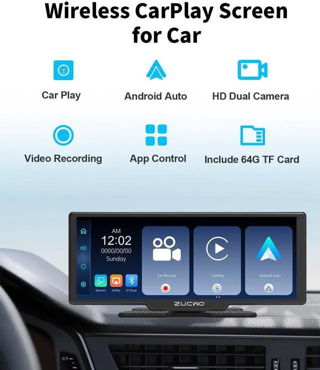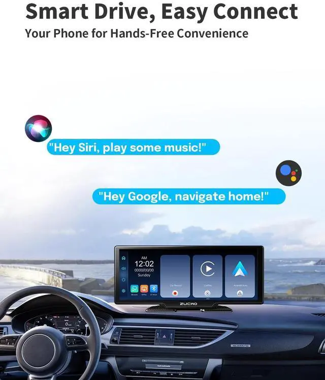 Wireless Carplay & Android AutoEasily connect your smartphone using wireless CarPlay or Android Auto. With the 10.26 -inch touch screen, you can access your smartphone's apps, utilize map navigation, send and receive messages, and play music using Siri or Google Assistant. Even if your car is older, adding wireless CarPlay can significantly enhance your driving experience. ^^ Voice Control & Safe drivingWith voice control through Siri or Google Assistant, you can navigate various features safely without needing to touch the screen. The device includes a 1080P waterproof backup camera, which enhances safety while parking and reversing, particularly at night.