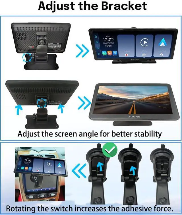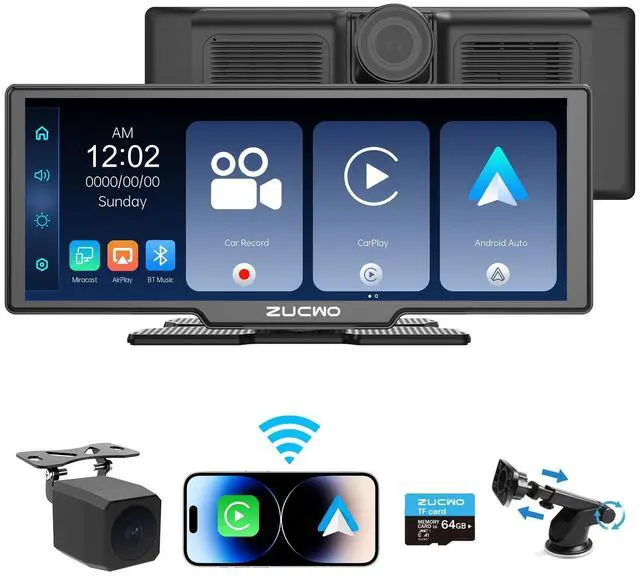 ^^ Easy Installation & Fit All VehiclesThis portable 10.26" CarPlay stereo comes with a self-adhesive bracket for easy installation on your dashboard console. The touchscreen car radio is compact and designed to fit most vehicles, including cars, trucks, vans, buses, and pickup trucks. ^^ GPS NavigationThe 10-inch portable Apple CarPlay screen features accurate real-time GPS navigation using Google Maps or Waze, ensuring a smooth and stress-free trip. ^^ Dash Cam Recording The 10.26IN CarPlay screen features a front camera and a 1080p waterproof wide-angle reversing camera with night vision capabilities.