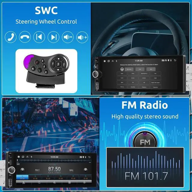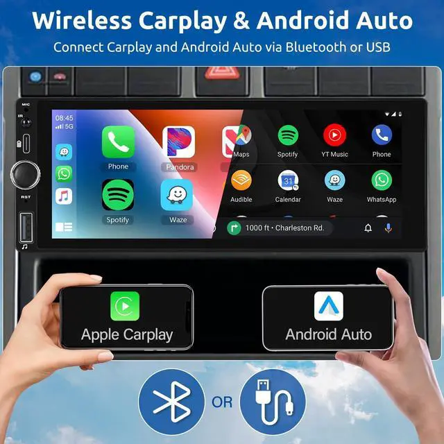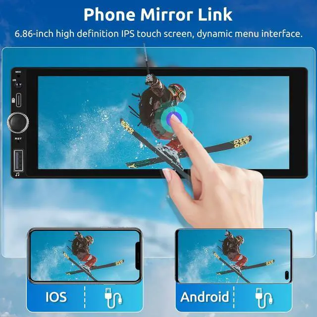 Control: 1 din touchscreen car stereo supports Wireless & Wired CarPlay/ Android Auto. Simply connect your smartphone to the carplay screen via Bluetooth to instantly access your phone's apps, music, gps navigation, and more. 1 din touch screen also supports voice control via siri or gogle assistant, without touching the screen, hands-free providing you with a safer and more comfortable driving experienceo ^^ Upgrade 5.0 Bluetooth & FM Radio & EQ SettingEnjoy smooth hands-free music, calls and more with the enhanced bluetooth 5.0 chip. 1 din car radio has noise reduction technology, brings you more stable and clear call / music. High-quality digital stereo FM radio with 18 preset stations and automatic channel search. 10 band EQ with 7 presets, combined with the bass filter features for different sound quality, you can enjoy excellent sound quality on the road ^^ 6.86 Inch IPS HD Screen, Phone Mirror Link Single din touch screen car stereo has IPS 1280*480 High resolution display screen, you can always see the screen clearly even not sit in front of stereo or under sunlight. The car radio player supports iPhone and Android cell phones to use the mirror link function.