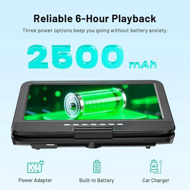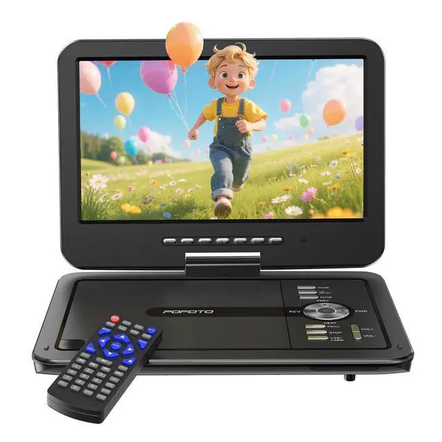 10.5" HD Flexible Screen -- POFOTO's portable DVD player features a vibrant 1024600 resolution display (60% sharper than standard 800480 screens). With 270 rotation and 180 flip capability, it delivers perfect viewing angles from any position. Enjoy brilliantly clear visuals that move with you ^^ Unique Button Design -- This DVD player portable has two sets of operating systems, one for daily viewing and another for on-board viewing. Intuitive buttons under the screen make play/pause/volume control a breeze, even mounted on a car headrest. Keep little travelers laughing and engaged for miles ^^ 6-Hour Playtime -- POFOTO portable DVD player for kids features a robust 2500 mAh battery, providing up to 6 hours of continuous play.