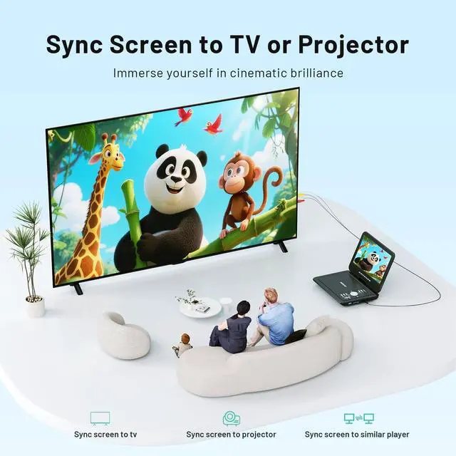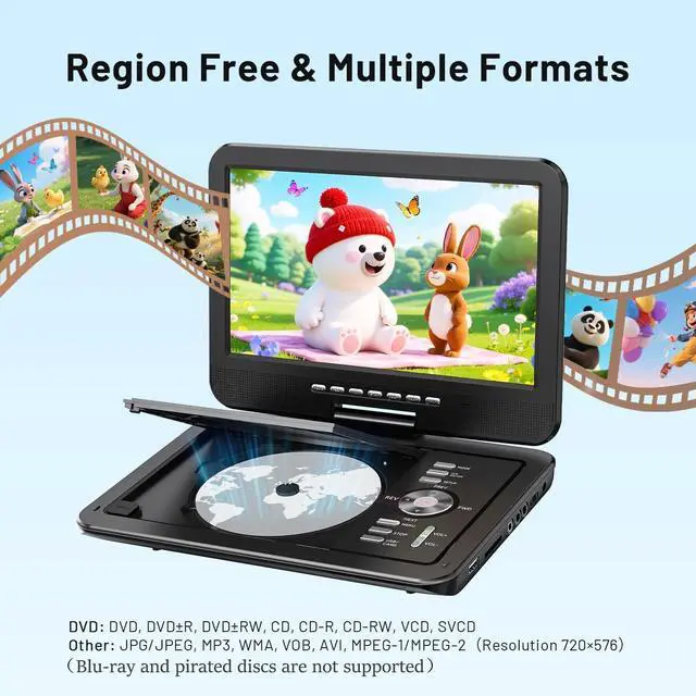 With a complete charging kit, including a 70-inch AC adapter and car charger, you'll never have to worry about running out of power during your adventures ^^ Region-Free & Multiple Formats -- The portable DVD player for car allows direct playback of DVD, DVDR, DVDRW, CD, CD-R, CD-RW, VCD and SVCD (Blu-ray and pirated discs not supported). It also supports multimedia files via USB and SD card (up to 32GB), including VOB, AVI, MP3, WMA, JPG, JPEG, MPG1/ MPG2 (resolution 720*756). The region-free design ensures seamless playback from any region ^^ Seamless Big-Screen Sync -- This portable DVD player with screen easily transforms your TV into a cinema.