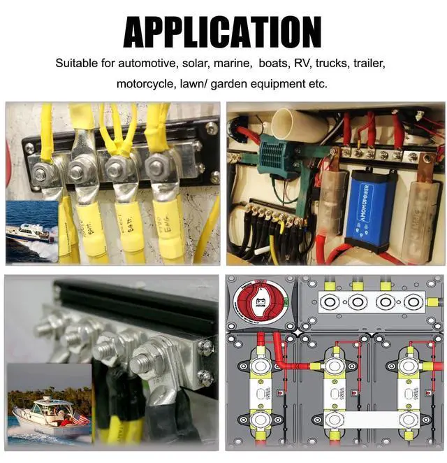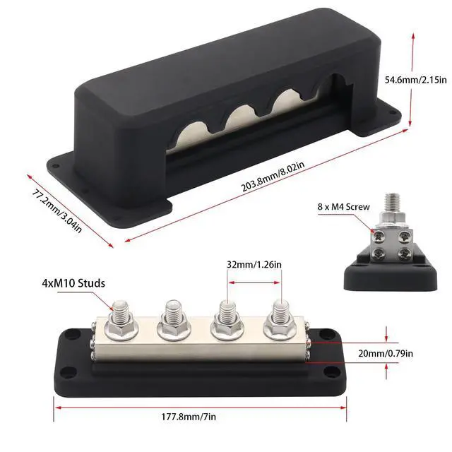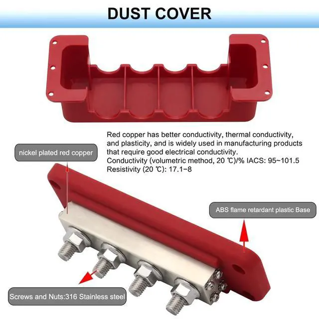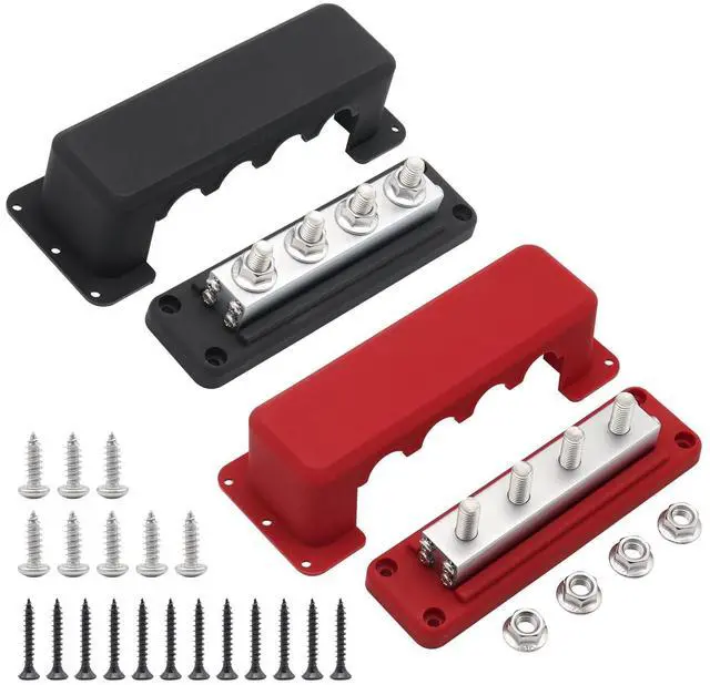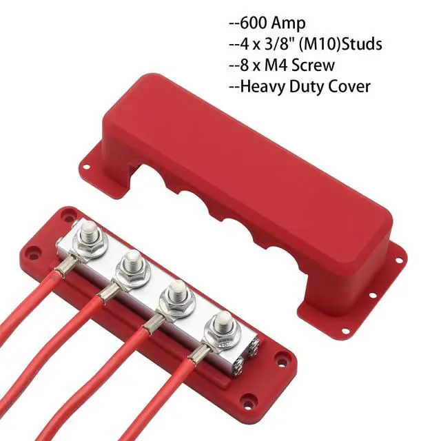 What You Get: 1x 600 Amp positive busbar with 4x 3/8" studs terminal ( red), 1x 600Amp ground bus bar with 4x 3/8" studs terminal ( black), 2x covers( red&black), 20x Screws ^^ The Bus Bars are Climate Friendly. Safer Chemicals. contain Recycled Materials. Worker well-being. Economical Package