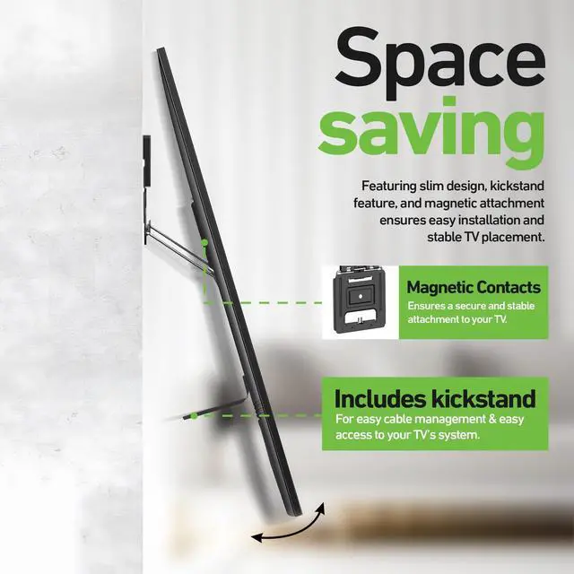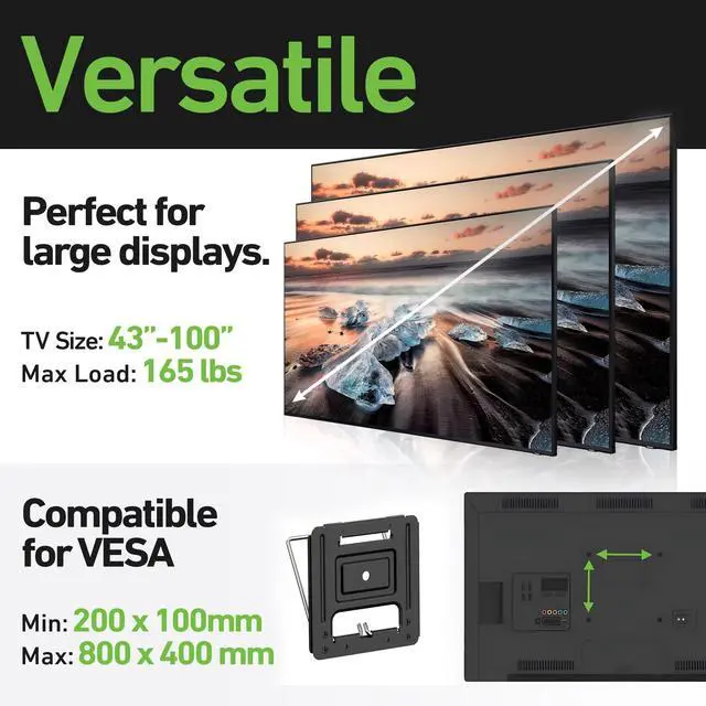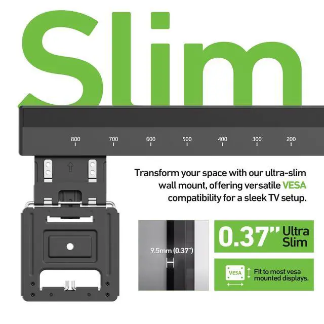 Ultra Slim TV Mount fits 43 Inch to 100 Inch TVs, Fits Flush Against the Wall, Only 9mm Profile. Tv Sits Right Up Against the Wall! ^^ Up to 165 pounds Ultra heavy Duty Weight Capacity. Comes with all the Hardware & Instructions for Easy Installation ^^ Flush Design Sits. 37 inches (9mm) Off the Wall. Like Artwork Hanging in a Picture Frame. That is About the Depth of an iPhone ^^ Genius Design Includes Visable Markers, Magnetic Contacts, And Bubble Level Included for Easy Installation. Also a Kickstand for Access to Wiring When Needed ^^ VESA Compatible 200x200, 300x200, 400x200, 300x300, 400x300, 400x400, 600x400, 800x400, 800x600 ^^ Install on any wall with the correct screws and Anchors.