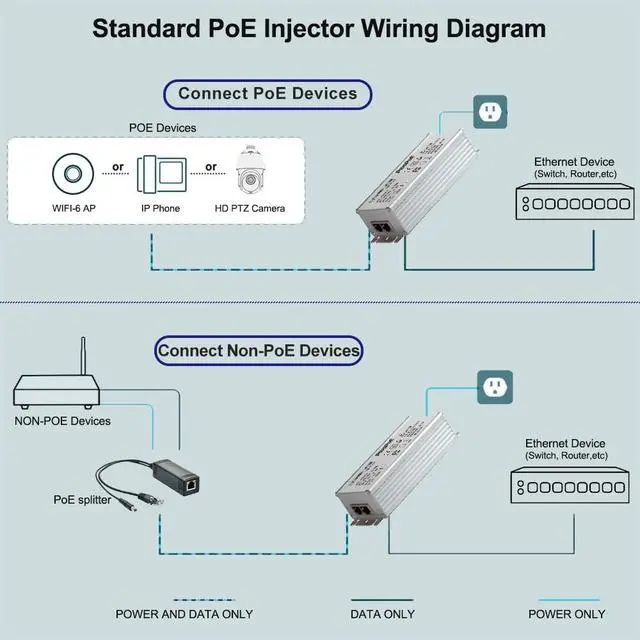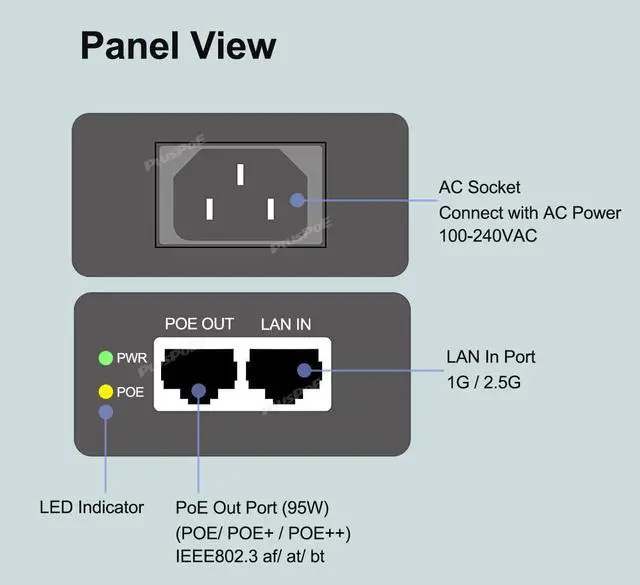 Feature: This PLUSPOE 2.5 Gigabit PoE injector adapter allows an PoE enabled device to be placed 328ft away from a power outlet. Ethernet terminals such as wireless LAN access point, IP phone, and web camera are powered remotely. It is especially design for outdoor networking facility and low port density installations. is designed with short circuit protection Over Current and Over Voltage Protection, keeping your devices safe.