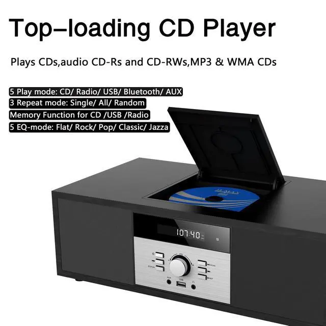 ^^ Top-loading CD Player: Playback your favorite CDs, CD-R/RW, MP3 CDs and audiobook CDs with 3 repeat modes (one / all / random) and 5 EQ modes (flat, classic, rock, pop, jazz). ^^