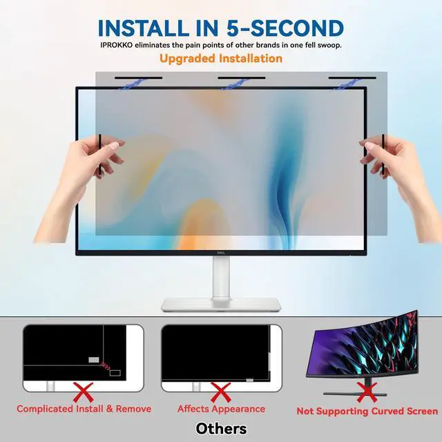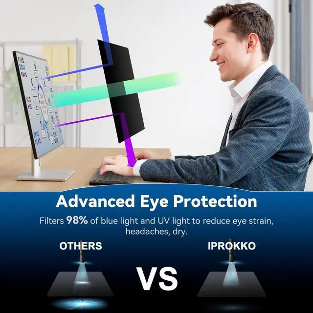 It also effectively guards against scratches and smudges, protecting your original computer monitor screen. ^^ [Eyes and Skin Care] Modern screens emit significant amounts of harmful light. Our Computer Privacy Screen Filter is specifically engineered to block 98% of blue light and UV radiation, relief their associated side effects like dry eyes, headaches, fatigue, insomnia, and skin aging. IPROKKO are committed to safeguarding your daily digital well-being. ^^ [Magnetic Installtion Make Everything Easy] Using it anytime you want. Only one step installs or remove the film shield. The screen cover could be washable and reusable.
