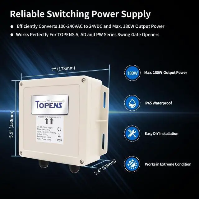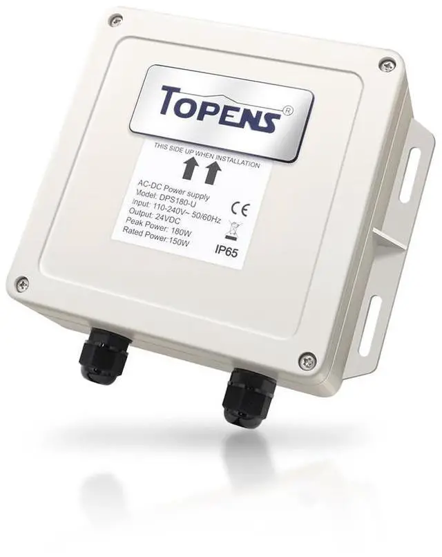 This wide voltage input adapter works flawlessly with TOPENS A, AD and PW series swing gate openers. It is recommended to use where AC electricity is accessible and stable. Plug the DPS180-U power converter into an outlet, and it will supply 24VDC power to the system directly. ^^ Clever Design - Solid ABS housing withstands a variety of harsh environments and promises a long-lasting performance. The weatherproof casing ensures superior protection against water and dust from all directions. The DPS180-U adapter requires no maintenance for outdoor use. Pre-connected cable allows for fast and safe connection.