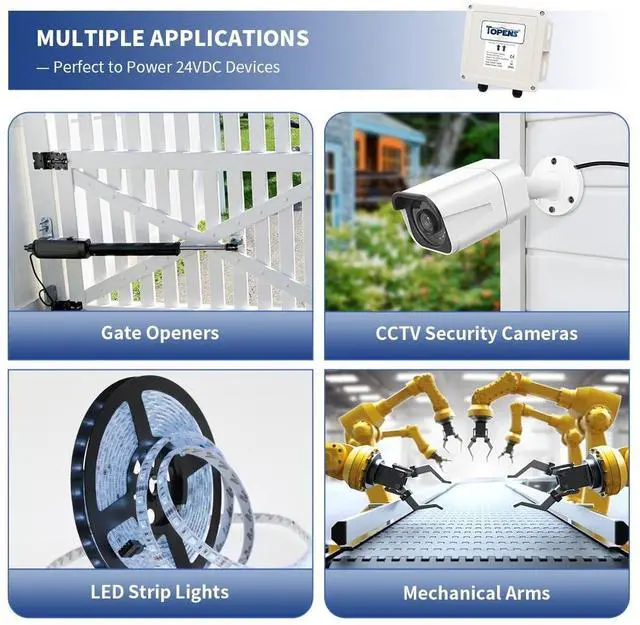 Reliable Switching Power Supply - TOPENS DPS180-U AC-DC Power Supply efficiently converts 100-240VAC to 24VDC, reducing electromagnetic interference to ensure stable voltage output. This converter provides 150W continuous output power and 180W of peak power. It has the high-quality control panel with a wide range of input voltage and is used in commercial, industrial and household appliances. ^^ Wide Applications - The DPS180-U voltage transformer can directly power all 24VDC devices, such as gate openers, CCTV security cameras, LED strip lights, mechanical arms, door access control systems and other DIY tools.