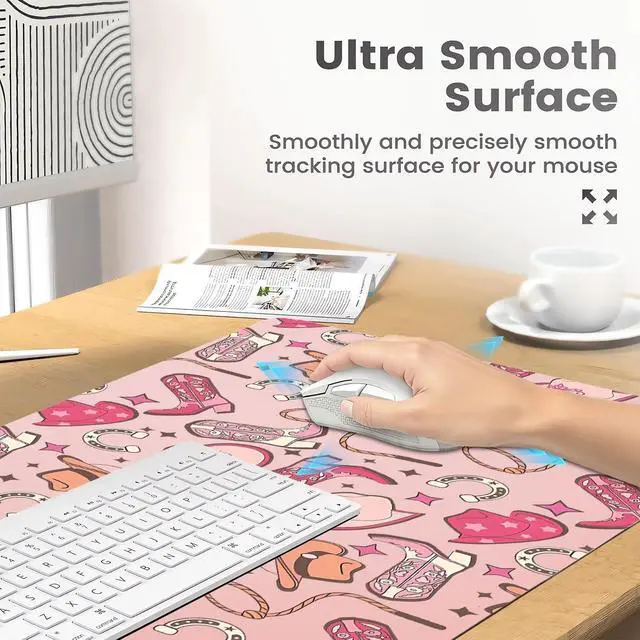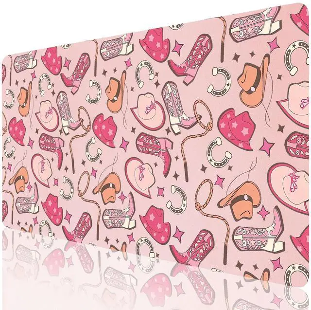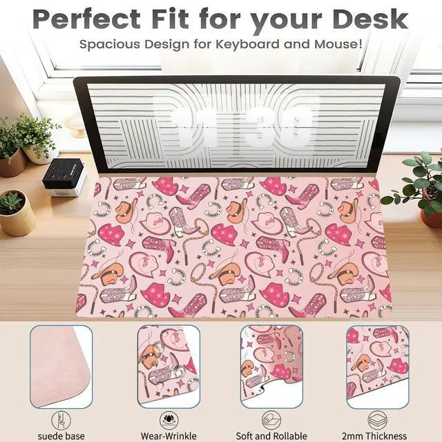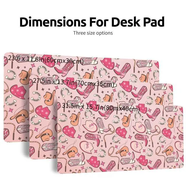 Pad Size: This cool cute cowgirl desk pad measures 31.5 ''X 15.7 '' inch ( 60*30 cm). The keyboard and mouse pad is large enough to have a mouse, gaming keyboard, and shields your desk from scratches. Durable Non-Slip MaterialExpertly crafted from premium leather and faux suede, this cool cute cowgirl large desk mat exudes durability. This Fashion trendy print large mouse mat firmly grips the desktop to ensure stable operation of your mouse and keyboard. It's specially designed for use on both sides, featuring a beautiful kawaii print on the front, the back is solid color. creating a 2-in-1 desk pad. Waterproof & Easy to