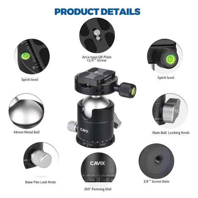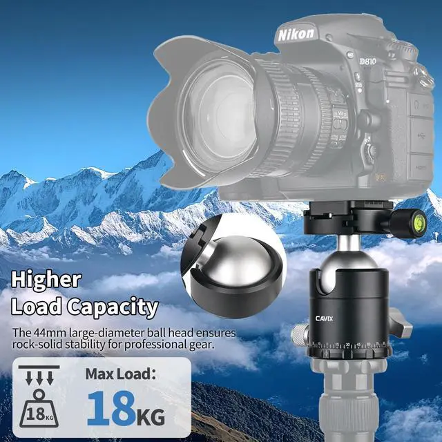 Smooth 360 Panoramic RotationEnables seamless horizontal panoramic shooting, perfect for capturing wide landscapes, architectural scenes, and panoramic group photos with precision. ^^ Exceptional Load CapacityBuilt with a 44mm diameter aluminum alloy ball and advanced locking system, it supports up to 39.68 lbs for stable and reliable performance with DSLR and mirrorless cameras and cinema camera setups with large lenses or accessories. ^^ Wide CompatibilityIncludes a standard 3/8" bottom screw hole for most tripods/monopods/sliders, a 1/4" Arca-Swiss quick release plate compatible with mainstream cameras. Comes with 3/8" to 1/4" screw adapter for mounting on other types of tripods.