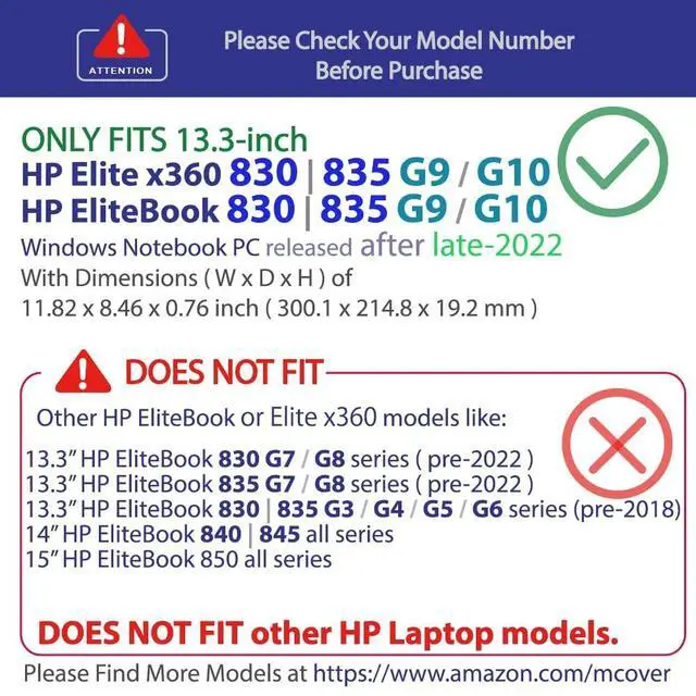 NOTE: Before placing order, PLEASE make sure to verify your laptop model number as this case is MODEL specific and NOT interchangeable. ^^ NOT fitting other 13", 14" & 15" HP EliteBook or PAVILION or ENVY laptops. NOT compatible with other HP laptops as well. ^^ Made of high-quality translucent polycarbonate material which is shatter-proof and will protect your 2022 ~ 2024 13" HP EliteBook 830 ^^ 835 G9 / G10 series and Elite x360 830 G9 / G10 2-in-1 Windows Laptop Computers all around ^^ Designed to perfectly fit the 2022 ~ 2024 13" HP EliteBook 830 ^^ 835 G9 / G10 series and HP Elite x360 830 G9 / G10 2-in-1 Series Windows Laptop Computers with dimension of 11.82 x 8.46 x 0.76 inch ( 300.1 x 214.8 x 19.2 mm ) ^^ 2-piece light-weight ( 7.7 oz or 218 g ) shell easily snaps on and off.