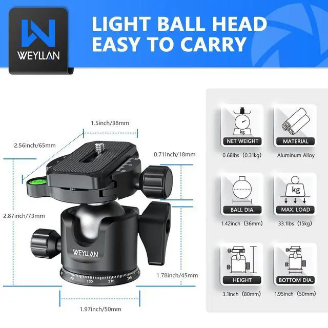 Low Profile Ball Head: This tripod head has a lower center of gravity and is more stable than traditional ball heads. The net weight is only 0.31 kg, and the maximum load can reach 33lbs/15kg. It vividly interprets the characteristics of light weight and strong carrying capacity ^^