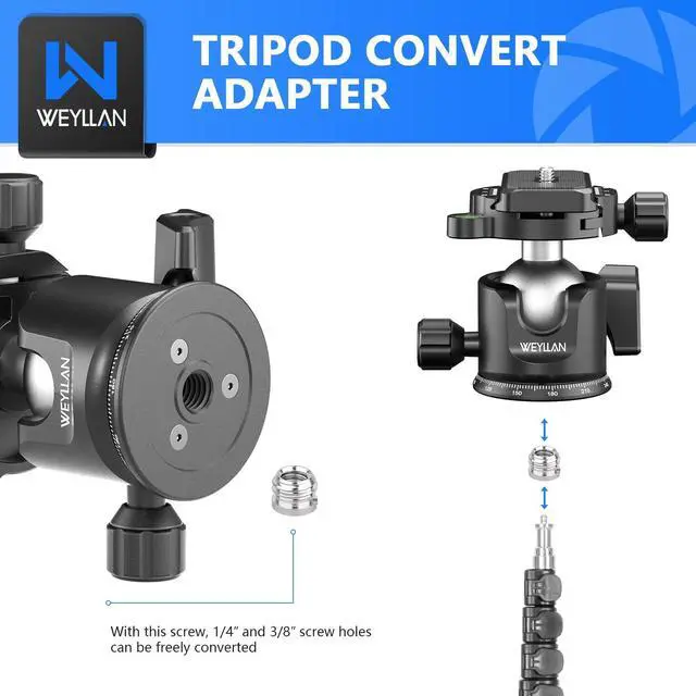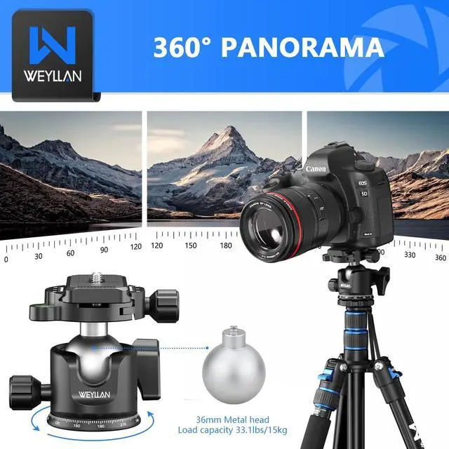 Camera Head: Rotate the 36mm tripod ball head 360 or tilt 90 in the U-shaped groove to quickly position the camera. 360 horizontal rotation is convenient for photographers to take panoramic photos ^^