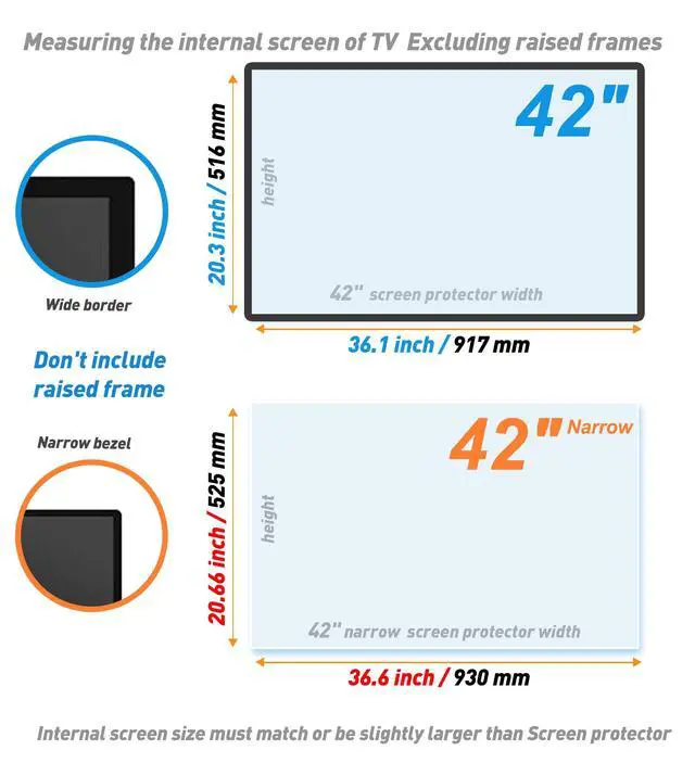 Fits Screen Sizes: Suitable for 42 inch TV screen and 42 inch Narrow bezel TV screen Please be sure to compare the size charts before purchasing to avoid confusion between the two sizes ^^ Anti glare