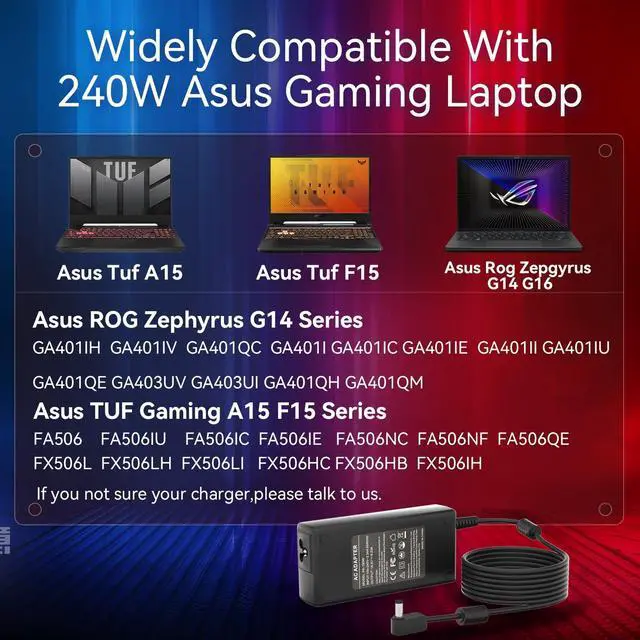 Connector size: 6.0X 3.7 mm. (Please refer to the picture to comfirm your connector size before purchase) ^^ For Asus Rog Zephyrus G14 G15 G16 ChargerFit for asus zephyrus G14 GA401IH GA401IV GA401QC GA403UV GA403UI gaming laptop. Also compatible with asus rog zephyrus G15 GA502IV GA502D GA503Q GA503QR GA502IU-ES76 GA503QS-BS96Q and asus rog zephyrus G16 ^^ For Asus Tuf Gaming Laptop ChargerFit for asus tuf A15 F15 series. Fit for tuf F15 FX506L FX506LH FX506LI. Also compatible with asus tuf A15 FA506 FA506IU FA506NF ^^ Tips For PurchaseFor more specific details about the product's model number, you can refer to the page below. If you are not sure, you can tell us and we will check it for you. ^^ Strict Quality InspectionThe upgrade of the chip ensures safe power supply without damaging the battery, effectively protecting electric energy from over current, short circuit, releasing excessive stable voltage, and preventing overcharging