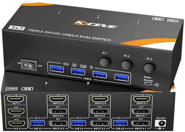 Pro Tip: Use certified 8K cables to prevent flickering and ensure signal stability for the better performance ^^ High-Speed 5Gbps USB Hub & Peripheral Sharing3 computers KVM Switch 3 monitors share devices seamlessly with the integrated 4-port USB 3.0 hub, offering transfer speeds up to 5Gbps. This Triple Monitors KVM switch DP HDMI allows all three computers to access peripherals like keyboards, mice, and printers without constant swapping. Its the ideal KVM switches 3 monitors solution for streamlined multi-system management ^^ Easy Switching & Wide System CompatibilitySwitch control between your three computers effortlessly using the button on the KVM switch HDMI Displayport or the included 1.5 m wired remote. An LED indicates the active source. This 3 computers KVM switch is compatible with Windows, macOS, Linux, and supports various HDMI and DP devices like PCs, laptops, and game consoles ^^ True Triple Display Support for Each ComputerKCEVE KVM Switch 3 Computers 3 Monitors system allows each connected computer to fully utilize three independent displays for an extended desktop workspace. The KVM switch HDMI +2 displayport input configuration ensures maximum compatibility and performance for demanding multi-monitor setups in office, conference, teaching, design, or development