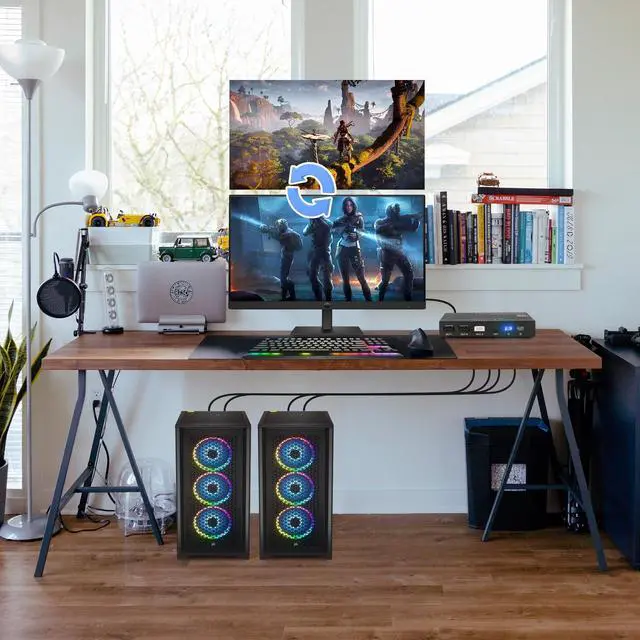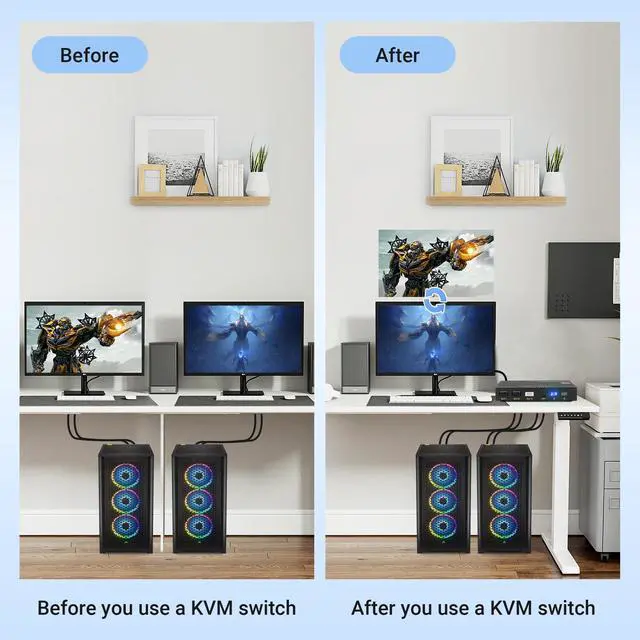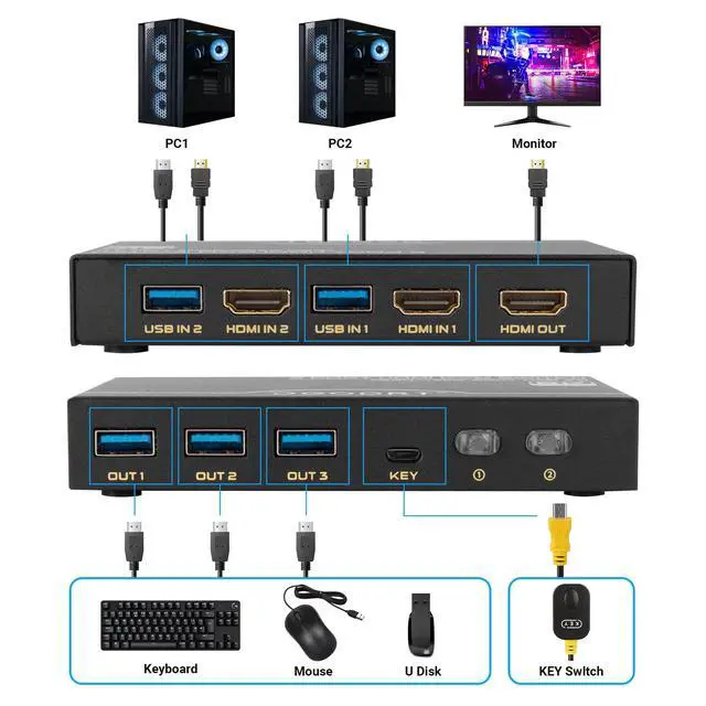 Metal KVM SwitchDGODRT 8K HDMI KVM Switch allows you to control 2 computers using only one set of control devices. You can easily switch between two PC, making work easier and more productive. ^^ USB 3.0 and 8K ResolutionSupport USB 3.0 devices that speed up to 5 Gbps. Support up to 8K@60Hz, 4K@120Hz, 3D and HDR. Enhance Your Visual Experience with Stunning 8K Clarity, immerse yourself in the brilliance of plot, where colors come alive and visuals become a captivating spectacle. ^^ Tidy desktop for youDGODRT KVM switch 1 monitors 2 computers including a wired remote control that you can switch between 2 computers easily.