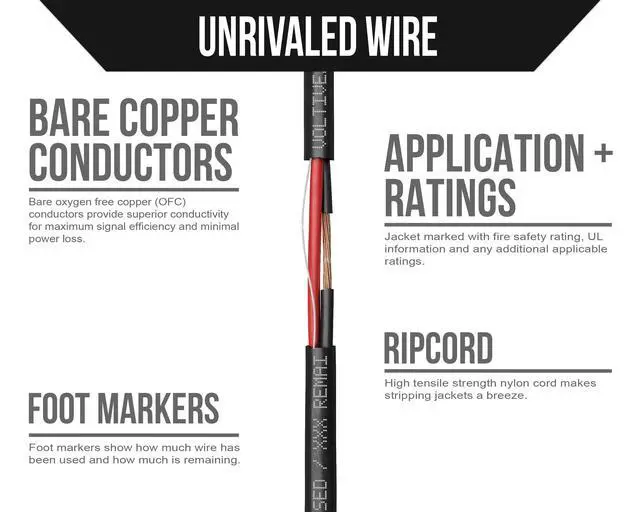 Reinforced handles, super-durable cardboard, & water resistant coating keep the box intact. Jacket features ripcord, UL information, re-order part number, and foot markers. ^^ GENERAL PURPOSE WIRE. Suitable for speakers, LED lighting, DC power, or any low voltage application that requires stranded 16 gauge wire with 2 conductors.