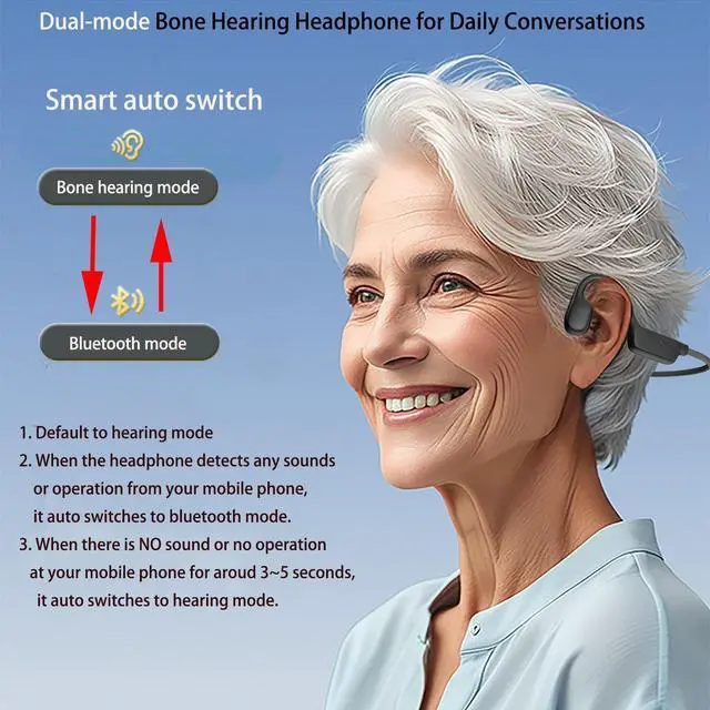 Bluetooth & Listening modes: Dual-mode headphone, default to hearing mode. When the bone headphone detects any sounds or operation from your mobile phone, it auto switches to Bluetooth mode. When there are no sounds or no operations from your mobile phones for around3~5 seconds, it auto switches to hearing mode. Adopt latest 5.3 Bluetooth tech and provide you stable connection and fast transmit speed.