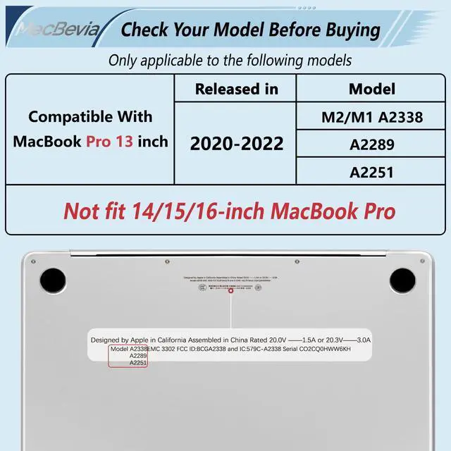 • Note: This case is designed exclusively for the 13.3-inch MacBook Pro with Touch ID 2022 2021 2020 Release (Compatible models only Models: A2338 M2/ M1 Chip/ A2251 / A2289). Not compatible with older MacBook Pro 13 inch Model: A1706 / A2159 / A1989 with Touch bar and A1708 without Touch bar. Please check the model number on the bottom of your MacBook to ensure compatibility