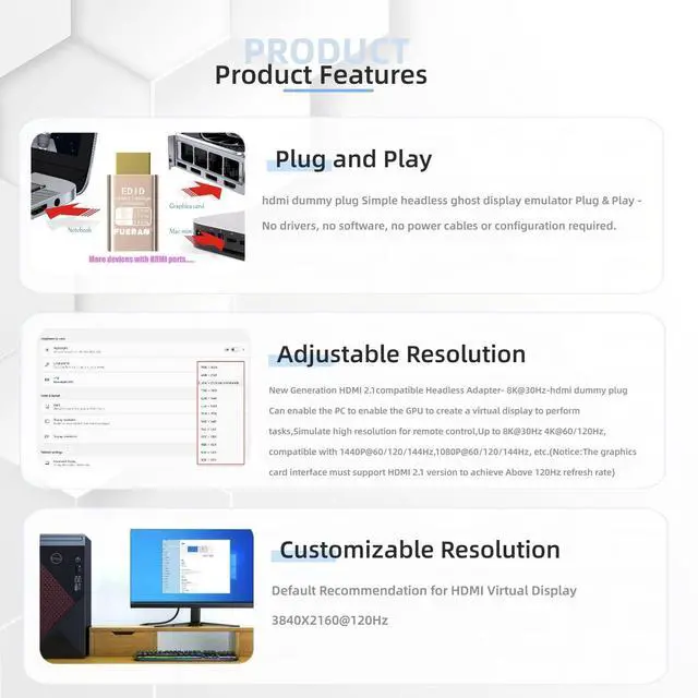 (Notice: The graphics card interface must support HDMI 2.1 version to achieve Above 120Hz refresh rate) ^^ hdmi dummy plug Simple headless ghost display emulator Plug & Play - No drivers, no software, no power cables or configuration required. The latest technology requires extremely low power and emits negligible heat Guaranteed stability for cryptocurrency mining, video rendering, and simulation mirroring. Not an HDMI Transmitter/Receiver ^^