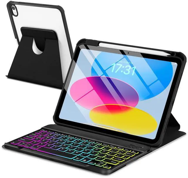 Generation (Model Number: A2696/A2757/A2777/A3162). Please check the model number starting with "AXXXX" on the back of your iPad before purchasing. (This product does not include: tablets, pencils! ) ^^ 7 Colors Rainbow Backlight KeyboardThe RGB rainbow backlight keyboard for iPad 10th generation can provide you with a typing experience in the dark, and the backlight has 7 adjustable colors. These colors can be automatically switched in breathing light mode, and the brightness of the keyboard can be adjusted by pressing Fn+light key. When you don't need the backlight, you can turn it off ^^ Rechargeable Keyboard, Long-Lasting Battery LifeThis keyboard has a built-in 400 mAh lithium battery, which charges for 2-3 hours and can work continuously for up to 50 hours under normal use (without backlit ), which will automatically enter sleep mode when not used for a long time to save power, and click any key to instantly the wake-up. Standby state lasts up to 90 days, which is very friendly for travel and mobile office ^^ Multi-Function Keys, Detachable KeyboardRich function shortcut keys allow you to use your iPad more efficiently and comfortably, such as editing documents, browsing applications, and creating presentations. The detachable keyboard can be used alone and can be disassembled when not in use, which is very convenient to carry ^^ Strong Magnetic Adsorption, 360-Degree RotatableThis protective case is made of premium PU leather and has 16 built-in powerful magnets, which can firmly absorb the keyboard to prevent the keyboard from moving and falling.
