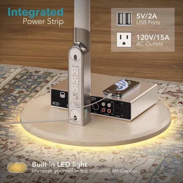 ^^ UNIQUE DESIGN: The mobile TV stand comes with invisible wheels on the bottom, extra ambient lighting on the bottom, and a convenient integrated power outlet on the back of the TV stand that includes 2 USB ports. Our portable TV stand is made of steel construction, consisting of white metal panels, a wood-grain colored chassis, warm white light strips, and grey plastic parts, it has been carefully designed to enhance its stability. ^^ Sturdy and