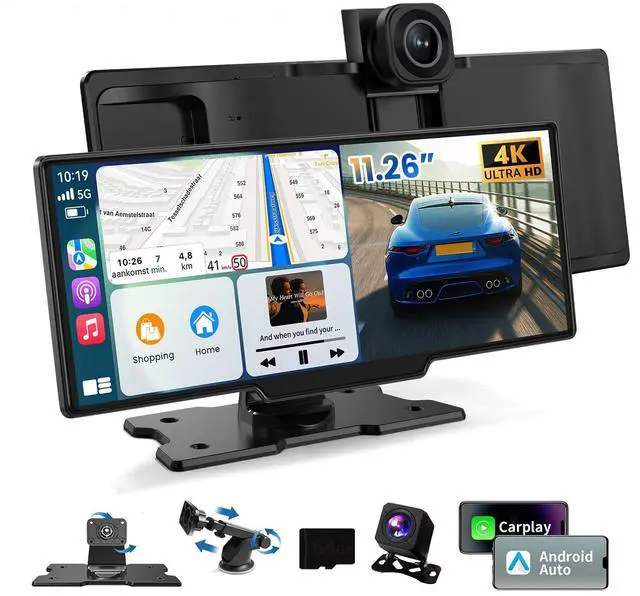 Camera Driving Recorder: This portable wireless carplay android auto screen can also be used as a driving recorder, equipped with a front 4K front camera+1080P waterproof reverse camera, dual screen recording function, and a wide-angle lens. The portable carplay screen for car allows drivers to visually see obstacles and pedestrians around the vehicle, effectively reducing the occurrence of accidents. Built in TF card for seamless loop recording. ^^ Stable and