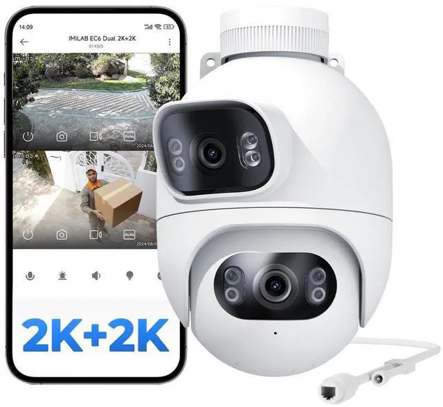 Dual Angle SurveillanceEC6 Dual plug in outdoor camera surveils two angles at the same time with the help of two lenses, collaborating to track moving objects in 360 upon detecting people, vehicles, or bikes. For instant checks in real time, the lower lens can be panned 360 or tilted 135 in the app ^^ 2K+2K Day/Night Full-Color VisionBoth outdoor security camera lenses support a resolution of 2K along with four LED lights and four infrared lights, delivering a vivid live view during the day and at night. Two-way audio enables you to connect with visitors or deter suspects in real time ^^ Subscription-Free Smart DeterrenceNever miss a threat, the outdoor security camera automatically triggers a siren, spotlight, or custom voice alert when motion is detected.