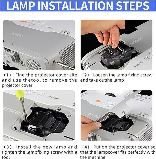 Send us your question via email and we will provide you with service. ^^ [ Installation and Safety ] Turn off the projector for EPSON projector bulb and wait for it to cool down before installing the lamp. Make sure that the connector is firmly connected. Turn off the projector during installation. You can easily install it in the projector, just like removing an old lamp.