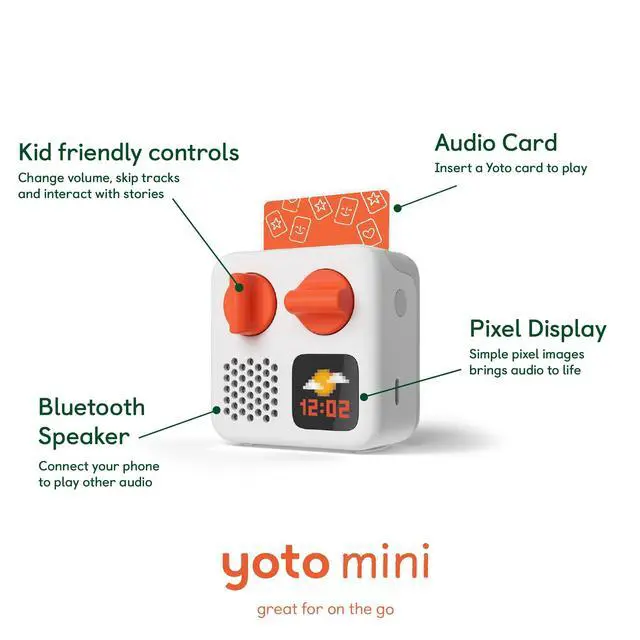 ^^ MULTI-PURPOSE: Features a pixel display to bring the audio to life, play sleep sounds, use as a bedtime storyteller, an alarm clock with OK-to-wake function, a portable Bluetooth speaker or use with headphones! ^^ CONTENT THAT GROWS WITH KIDS' MINDS: Explore 1000+ cards of bestselling novels, music, fun activities, free podcasts, radio, soundscapes, useful timers or even create content with a Make Your Own card!