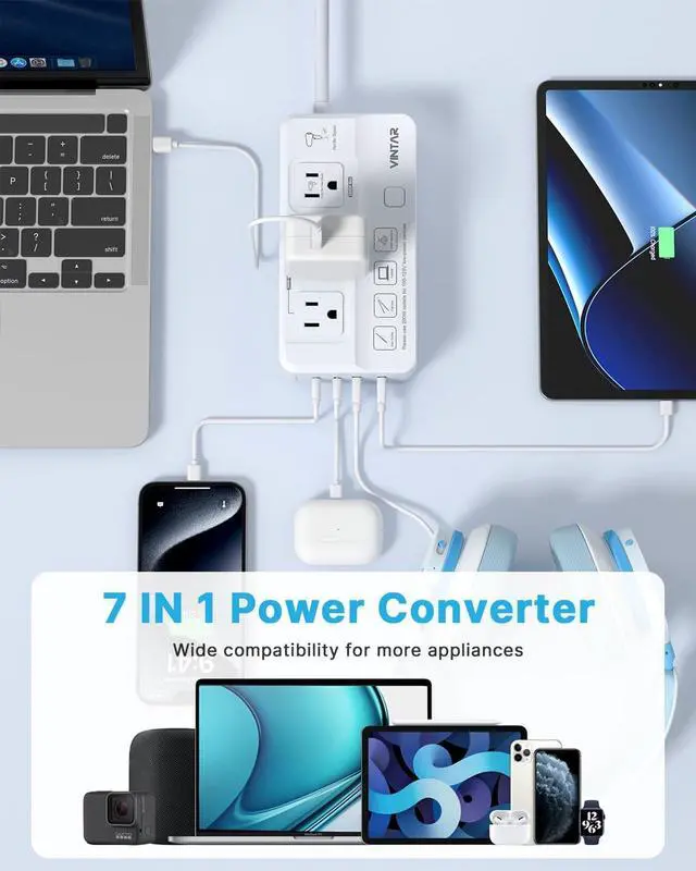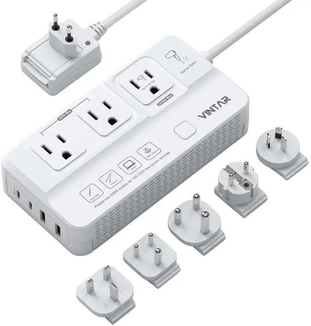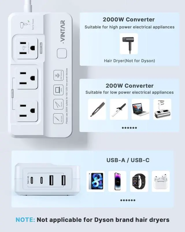 Voltage Conversion: All AC power outlets are step down converters, it converts voltage (220-240V, 50/60Hz) to US voltage (110V, 60Hz). The 2000W converter area supports hair dryer from 5W to 2000W max; The 200W converter area is support maximum 200W total voltage peak convert, suitable for curling iron, hair straightener, laptop and other electrical appliances ^^ Global Travel