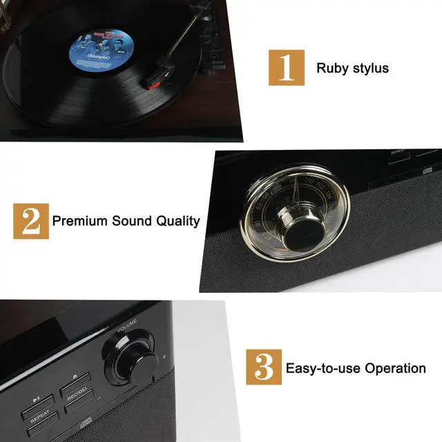 Stereo Sound: Experience vinyl as intended with 3 playback speeds (33 1/3, 45, 78 RPM) for all vinyl types. Upgraded built-in stereo speakers deliver warm, clear sound, perfect for seasoned lovers chasing classic quality or beginners starting their collection. ^^ CD Player with
