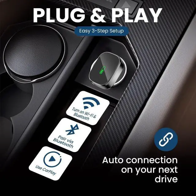 Easy Plug & Play Auto Connect Every TimeSet up in just three steps. Plug it in, pair via Bluetooth, and youre good to go. After the first setup, this CarPlay adapter auto-connects instantly whenever you start the engineeffortless convenience every drive.