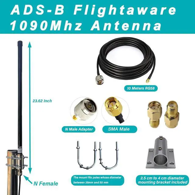 ^^ Packing Listing: 1x1090mhz flightaware Antenna & 1X 32.80 ft N-male to SMA-male RG58 coaxial cable & 1set hardware (u-bolts, nuts, washers, lock washers). ^^ Compatible with all types of receivers, including ADSBexchange, FlightAware, FlightRadar24, AirNav Systems, RadarBox, etc. Suit for radio dongles ADS-B DVB-T DVBT Defined Radios SDRs USB flightaware pro stick NooElec NESDR SMArt - Premium NooElec RTL-SDR stic Aluminum Enclosure. Works with Raspberry Pi and Windows PC.