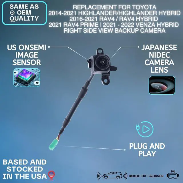 Right Side View Backup Camera Replaces for 2014-2021 Toyota Highlander/Highlander Hybrid ^^ 2016-2021 RAV4 / RAV4 Hybrid ^^ 2021 RAV4 Prime ^^ 2021-2022 Venza Hybrid OE Part # 867900E100 8679048160