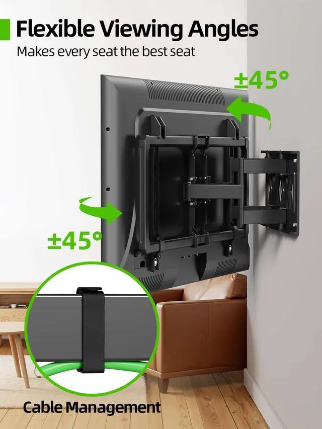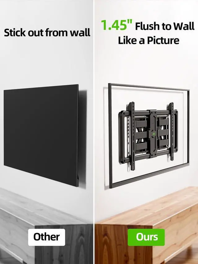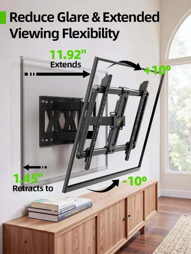^^ Space Saving: Ultra slim TV wall mount offers a great space saving solution with a stylish appearance by placing the TV bracket 1.45 inches closer to the wall. Meanwhile, this large full motion TV mount can extend 11.92 inches for comfortable viewing. ^^ Adjustable View Comfortable & Glare reduction: Our TV bracket with dual articulating arms includes +10/-10 tilt, 45 swivel (maximum swivel angle depends on your TV). All of these features will make your TV flexible, say goodbye to annoying glare, and allow for better viewing depending on your seating in the room.