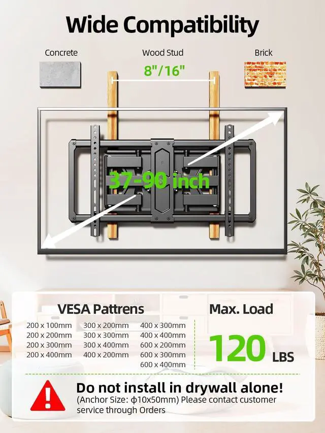 TV Mount Compatibility: The USX MOUNT tv wall mount fits most 37-90 inch TVs and holds up to 120lbs of weight with MAX VESA 600 x 400mm supporting up to 16 inch wood stud spacing. Please check the VESA, TV weight, wood studs spacing, and possible blocked input for a better experience.