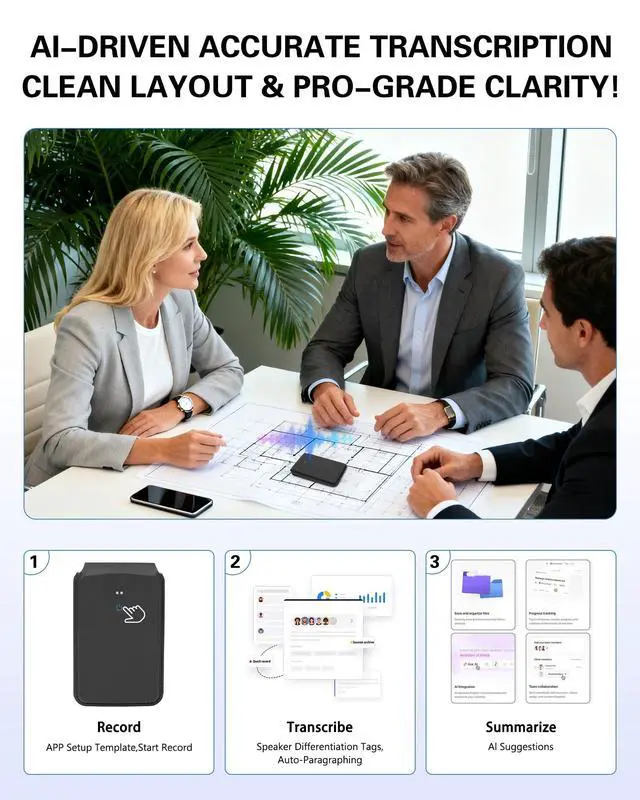 ^^ 137-Language Translation & All-In-One PackageBreak through language barriers with support for 137 global languages, ideal for international business, travel, or cross-cultural communication. The package includes everything you need: 1 AI voice recorder, 1 metal ring, and 1 magnetic charging cablestart using it right out of the box. ^^ Noise Cancellation & Military-Grade Cloud SyncIts pro hybrid mic system + lab-tested noise cancellation blocks 90%+ background noisecafes, crowded rooms, noisy outdoors. Every word stays studio-clear. Safe, clear, easy, Capture key moments, save recordings straight to your phone app. Files auto-backup instantly to military-grade encrypted cloud storagesecure global access, locked privacy, recordings ready anytime. ^^ 35-Hour Marathon Battery LifeEquipped with a long-lasting battery, it runs continuously for 35 hours (2100 minutes) on a single charge. No more worrying about battery life during multi-day meetings, field research, or long interviewsperfect for frequent travelers and heavy users. ^^ 12-Month FREE Premium Access IncludedUnlock Unlimited Transcriptions, AI Pro Templates & Smart Notes with This Powerful Recorder. Effortlessly turn audio into structured docsperfect for business reports, academic notes, or content creation. Streamline your workflow & turn voice into polished, actionable content fast. ^^ Perfect Holiday Gift for Loved OnesThis practical, high-tech AI recorder is ideal for your beloved on U.