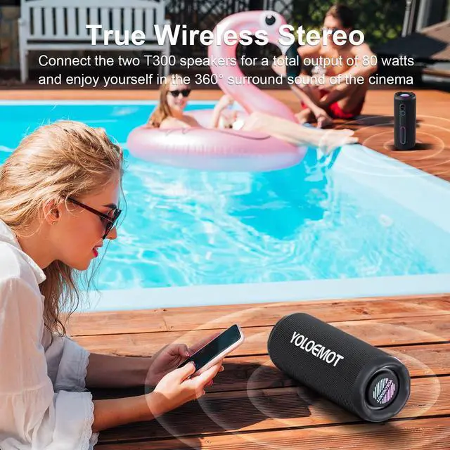 Wireless Bluetooth Speaker: Experience our most powerful portable T300 speaker, and enjoy YOLOEMOT Enhanced bass, powerful mid-range and clear treble, without any distortion at any volume sound that fills the entire room. Combined with dual passive radiators and the EQ audio effect mode, the peak power can be increased to 50W. Even when played at a low volume, this guarantees that you can enjoy clear, loud music in any setting ^^ Enhanced BassThe bass bluetooth speakers T300 features an integrated BASS system with powerful bass capabilities, effortlessly extending audio down to 30Hz and even below 20Hz. Even at low volumes, you can distinctly feel the bass vibrations and surround sound. Experience deep and powerful bass. Supports EQ mode adjustment, allowing easy switching between bass and vocal professional EQ modes to meet diverse listening needs. This is the perfect gift for music lovers and tech enthusiasts ^^ IPX7