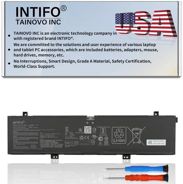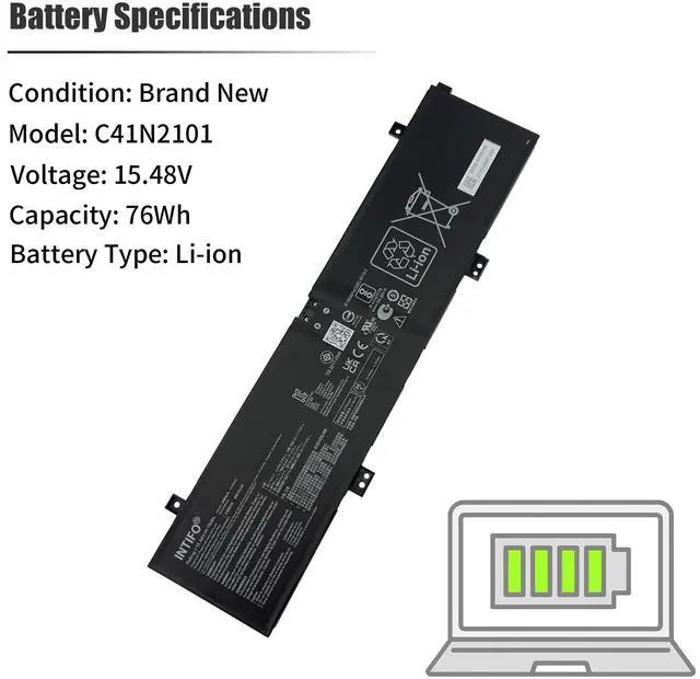 Manufacturer Warranty: One-year ^^ Replacement for Part NumberC41N2101 0B200-04110000 0B200-04110100 4ICP4/59/122 ^^ Compatible with Laptop ModelsASUS ROG Zephyrus G14 GA402 GA402R GA402RJ GA402RK GA402NI GA402NJ GA402NU GA402NV GA402XI GA402XU GA402XV GA402XY GA402XZ Series, ASUS TUF Dash F15 FX517 FX517ZC FX517ZE FX517ZM FX517ZR Series, ASUS TUF Gaming Dash F15 FX517ZC Series, ASUS VivoBook Pro 15X OLED K6501ZM M6501RM M6501RR Series, ASUS Zenbook Pro 14 Duo OLED UX8402ZA UX8402ZE UX8402VU UX8402VV Series, ASUS Zenbook Pro 17 UM6702RA UM6702RC Series ^^ Quality & SecurityINTIFO uses only OEM grade quality components. All products are certified by CE, FCC, UL, RoHS for safety. ^^ TipsBefore placing an order, we recommend that you open the back cover of your laptop, check and confirm your original battery model and appearance. Compare with our battery picture, confirm especially the position of the connector and the length of the cable.