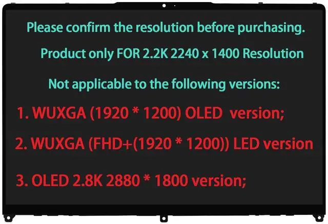 The product has multiple Display resolutions that are incompatible with each other. Please note that our product is only compatible with the 2.2K (2240 * 1400) version. It is not applicable to the following versions: 1. WUXGA OLED WUXGA (1920 * 1200) version; 2. OLED 2.8K 2880 * 1800 version; 3. WUXGA (FHD+1920 * 1200) version. Version confirmation method: My laptop - Display - Maximum resolution